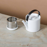 Moderne Teekanne aus weißem Porzellan mit integriertem Filtereinsatz