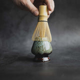 A hand-made ceramic matcha whisk holder with glossy turquoise glaze